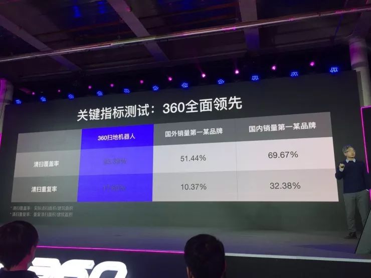 现场,360智能首席科学家谭平展示了一组测试数据。在给定的测试环境下,360扫地机器人的清扫覆盖率高达93.39%、清扫重复率仅为17.60%,性能超过iRobot和科沃斯的扫地机器人。