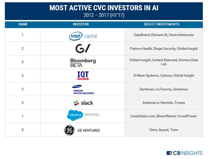 在所有的CVC中,Intel Capital和Google Ventures是在人工智能领域最活跃的,从2012年以来投资的人工智能领域的项目最多,Bloomberg Beta位列其次。