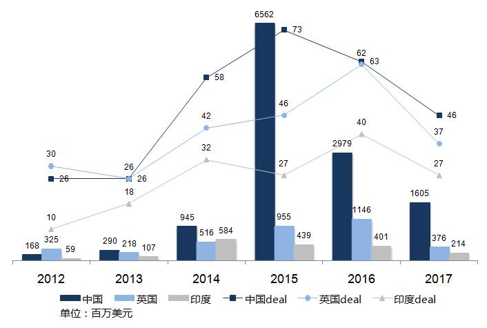 互联网领域以350笔交易位列首位,这比2016年下半年增长3%,但总融资金额则下降了6%。