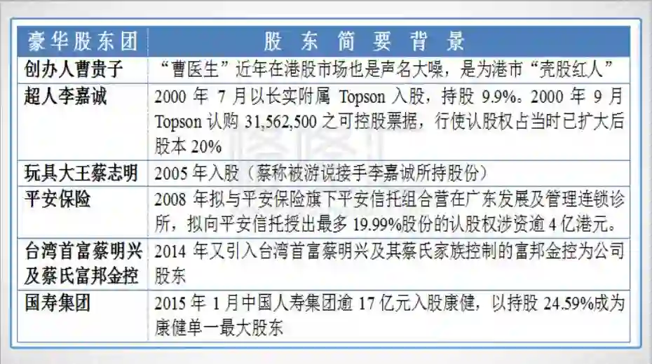 康健国际医疗创建于1989年,原本只是一间普通医疗诊所,后与西医及牙医结盟得以壮大实力。2000年,创始人曹贵子将诊所运作上市。当时还获得了李嘉诚旗下的长实附属公司入股。