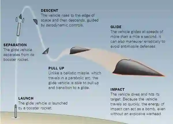 目前,有两种高超音速导弹。一种是高超音速滑翔飞行器(HGV),是由火箭发射进入大气层,在40千米到100千米的高度向目标飞行。