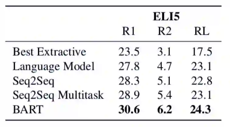 表 5:BART 在难度较高的 ELI5 抽象问答数据集上取得了当前最优结果。