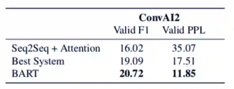 表 4:BART 在对话回答生成任务上的性能优于之前研究。困惑度基于 ConvAI2 官方 tokenizer 进行了重新归一化。