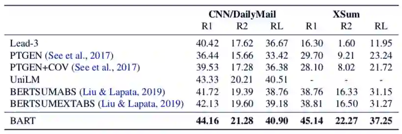 在提供同等的训练资源时,BART 可在 GLUE 和 SQuAD 数据集上实现与 RoBERTa 相当的性能,并在抽象对话、问答和文本摘要等任务中获得新的当前最优结果,在 XSum 数据集上的性能比之前研究提升了 6 ROUGE。