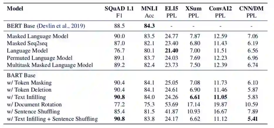 研究人员还使用控制变量实验复制了 BART 框架内的其他预训练机制,从而更好地评估影响终端任务性能的最大因素。