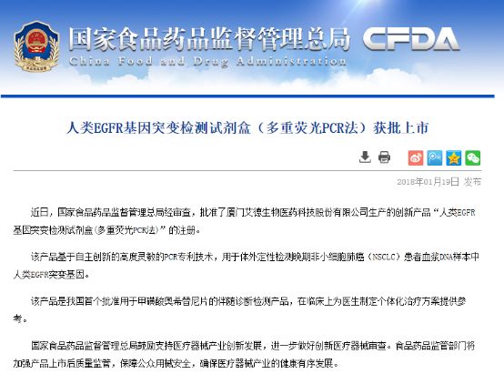 近几年,已有多种技术方法应用于血液样本中ctDNA的EGFR突变检测。上海肺科医院周彩存教授团队发表在《Oncotarget》上的一篇综述文章回顾总结了目前常用的各种血液EGFR突变检测技术[5],其中提到了一种基于快速、经济、可及性强、临床已广泛应用于EGFR突变检测的ARMS技术的升级技术—— Super-ARMS®技术,用于血浆样本EGFR突变检测的灵敏度可达0.2%。该技术产品——Super-ARMS® EGFR试剂盒更是以伴随诊断标准严格审批,于近期获得中国食品药品监督管理总局(CFDA)批准上市,成为我国首个以伴随诊断这一高标准获批的诊断产品。