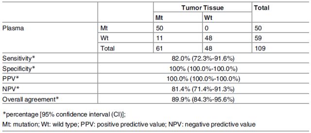 临床数据2:同年,温州医科大学附属第一医院李玉苹教授团队在《PLOS ONE》上发表了一项关于Super-ARMS®的研究成果[6]。研究结果显示, Super-ARMS®检测血浆样本EGFR突变的敏感性82.0%、特异性100%、阳性预测值(PPV)100%、阴性预测值(NPV)81.4%。血浆与组织样本检测总体一致率达89.9%。