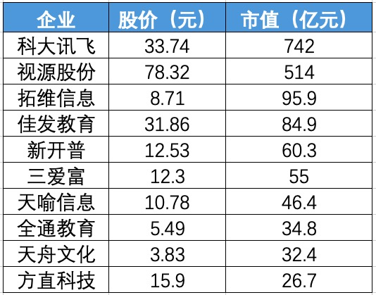 在现有的这类主要玩家中,市值超过 100 亿元的仅仅有科大讯飞和视源股份。因此,这一赛道的特点是:缺乏足够的头部,主要以中小企业为主,行业集中度低。且头部公司和互联网大公司的体量相比,规模差距可以一眼辨之。