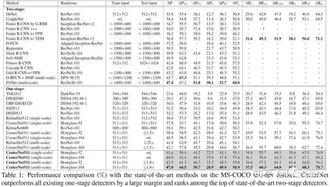 本实验在最具挑战性之一的 MS COCO 数据集上进行测试, 我们选了一些比较有代表性的工作做了对比。实验结果表明 CenterNet 获得了47%的AP,超过了所有已知的 one-stage 检测方法,并大幅度领先,其领先幅度至少达4.9%。Table2为 CenterNet 与 CornerNet 的单独对比。最近目标检测方法在COCO数据集上基本在以百分之零点几的精度往前推进,因为coco数据集难度很高,而我们的 CenterNet 往前推进了将近5个百分点。同时,CenterNet 的结果也接近two-stage方法的最好结果。值得注意的是,CenterNet 训练输入图片分辨率只有 511X511,在 single-scale下,测试图片的分辨率为原图分辨率(~500),在 multi-scale下,测试图片的分辨率最大为原图分辨率的1.8倍。而two-stage的输入图片的分辨率一般最短边也要>600,甚至更大,比如D-RFCN+SNIP [3] 和 PANet [4]。而且我们的方法是 Train from scratch。