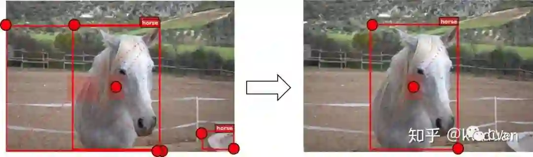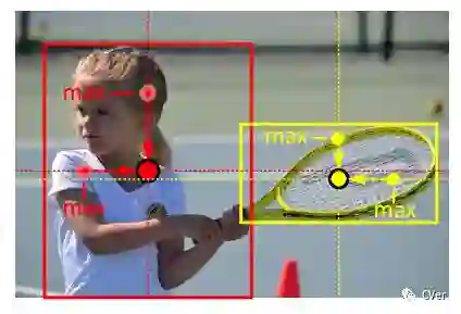 我们发现中心区域的尺度会影响错误框去除效果。中心区域过小导致很多小尺度的错误目标框无法被去除,而中心区域过大导致很多大尺度的错误目标框无法被去除,因此我们提出了尺度可调节的中心区域定义法 (公式1)。该方法可以在预测框的尺度较大时定义一个相对较小的中心区域,在预测框的尺度较小时预测一个相对较大的中心区域。如 Fig3 所示。
