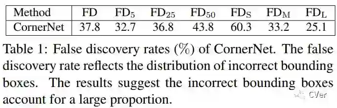 为了能够量化的分析误检问题,我们提出了一种新的衡量指标,称为FD (false discovery) rate, 此指标能够很直观的反映出误检情况。FD rate 的计算方式为 FD = 1-AP, 其中 AP 为 IoU 阈值取[0.05 : 0.05 : 0.5]下的平均精度。我们统计了 CornerNet 的误检情况,如表1所示: