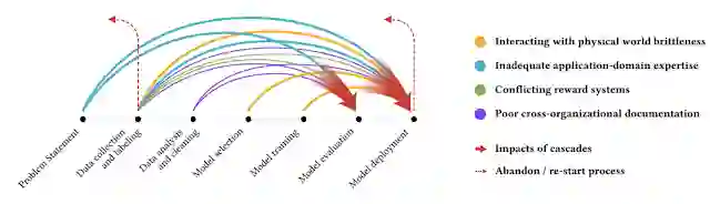不同颜色的箭头表示不同类型的数据级联,它们通常在上游产生,在机器学习开发流程中混合,再在下游显现