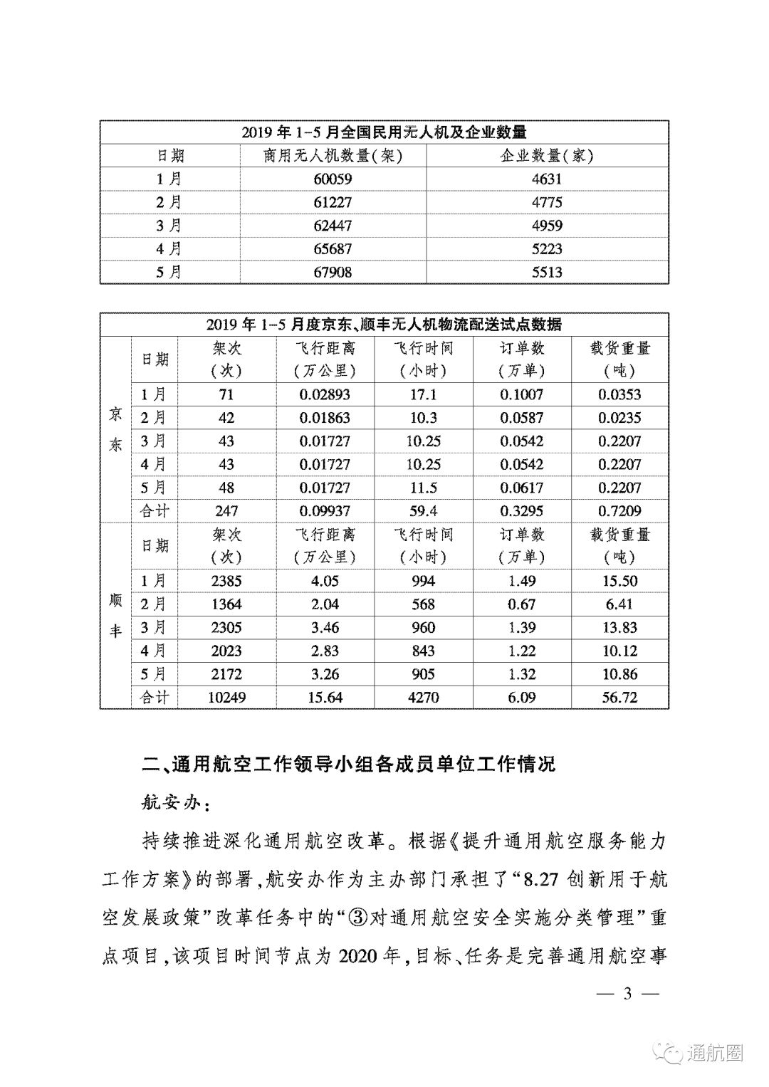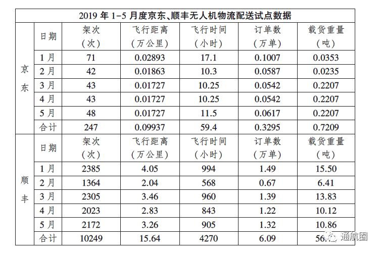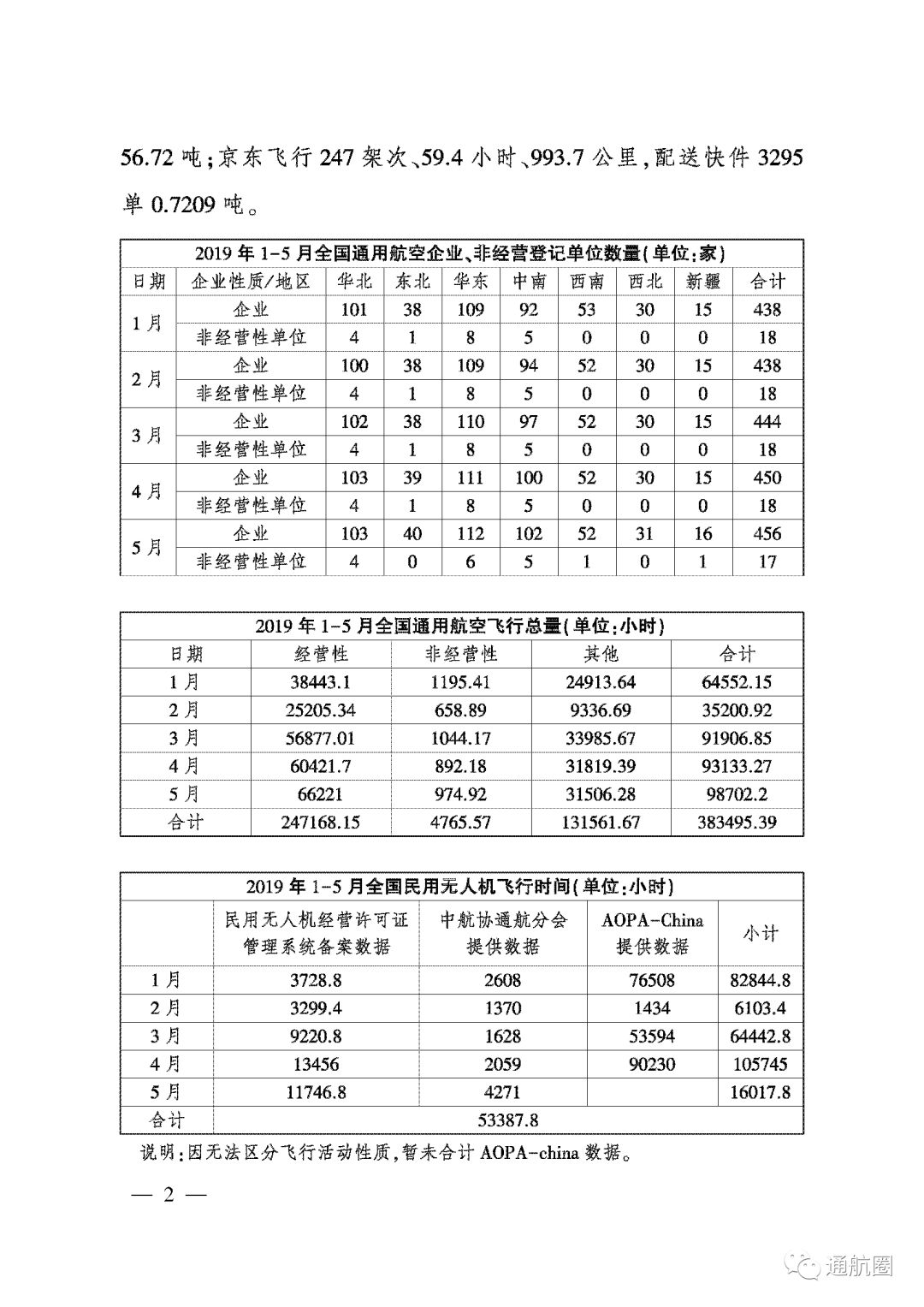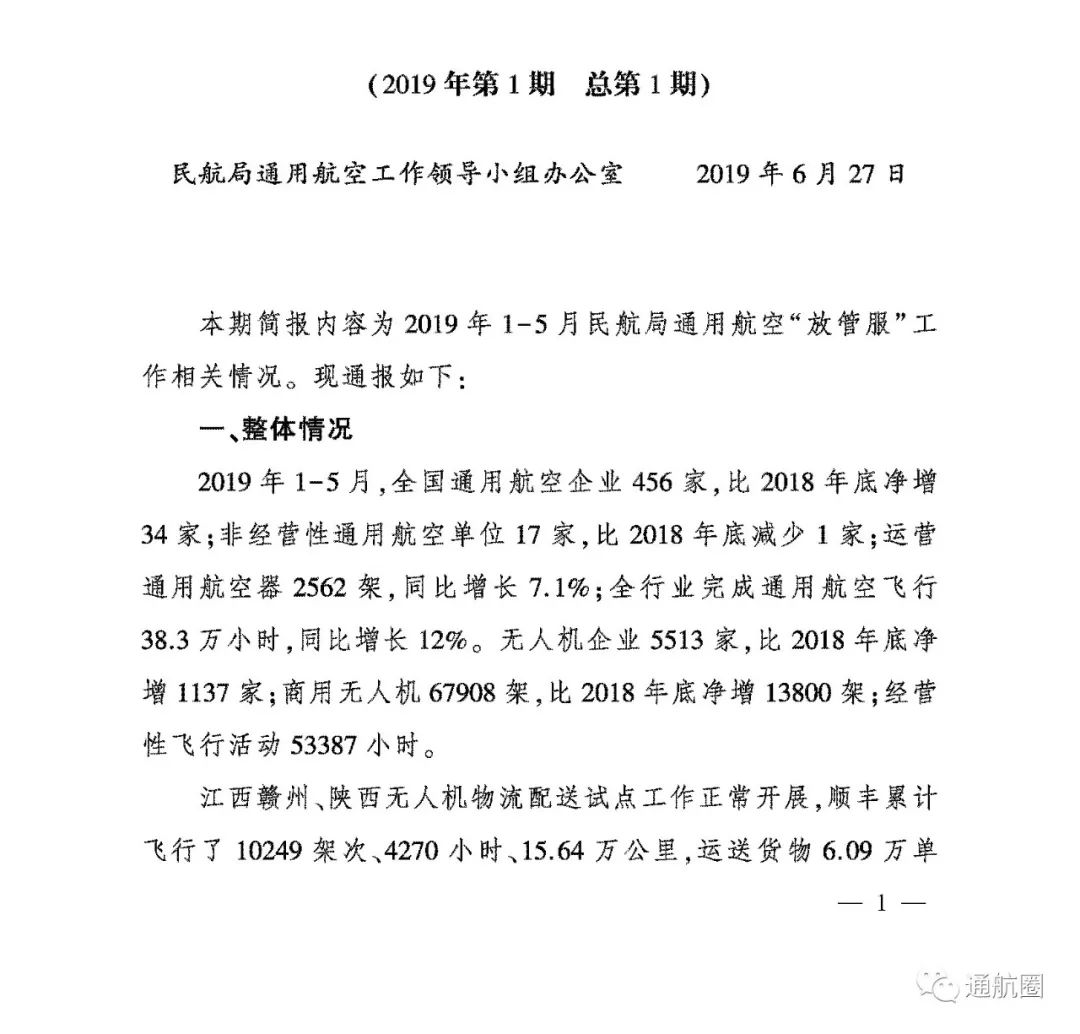 近日,民航局运输司印发了《民航局通用航空“放管服”工作简报(2019年第1期)》,对2019年1-5月民航局通用航空“放管服”工作情况进行了通报。其中,2019年1-5月,全国通用航空企业456家,比2018年底净增34家;非经营性通用航空单位17家,比2018年底减少1家,运营通用航空器2562架,同比增长7.1%;全行业完成通用航空的飞行38.3万小时,同比增长12%。无人机企业5513家,比2018年底净增1137家;商用无人机67908架,比2018年底净增13800架;经营性飞行活动53387小时。江西赣州、陕西无人机物流配送试点工作正常开展,顺丰累计飞行了10249架次、4270小时、15.64万公里,运送货物6.09万单56.72吨;京东飞行247架次、59.4小时、993.7公里,配送快件3295单0.7209吨。