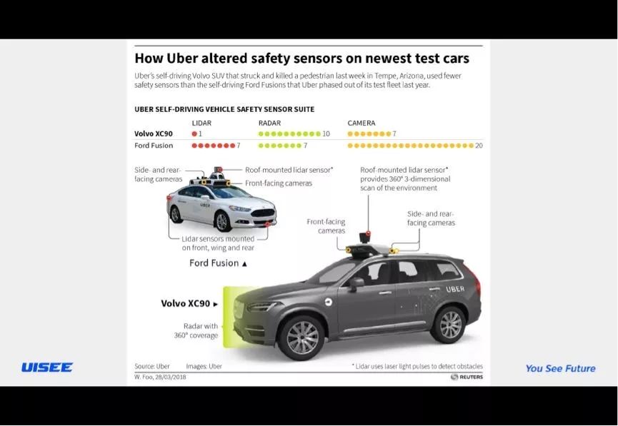 再看Uber,前段时间出现了一个事故。路透社马上就分析了,它为什么出事故:原来激光雷达从7个减到了1个,雷达从7个变成了10个,摄像头从20个变成了7个,极大地减少了车辆的传感能力,缺乏敬畏之心。