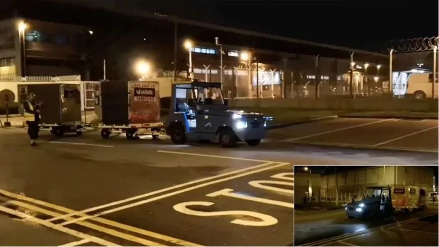 大家看这个车上是没有人的,我们经常看到无人驾驶,结果车上还得坐着安全员。我们这个车真正实现了车上无人的运营,可以拖行李,拖货物。不是从飞机上运过来,靠近航站楼就完了,它可以自己开下航站楼,开到传送带。它不仅仅是可以在室外跑,也可以在室内跑。