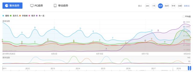 到了6月,网剧《镇魂》开播,2009年开始演戏的朱一龙,作为「被埋没的演技派」走红,百度指数又一举超越四大:
