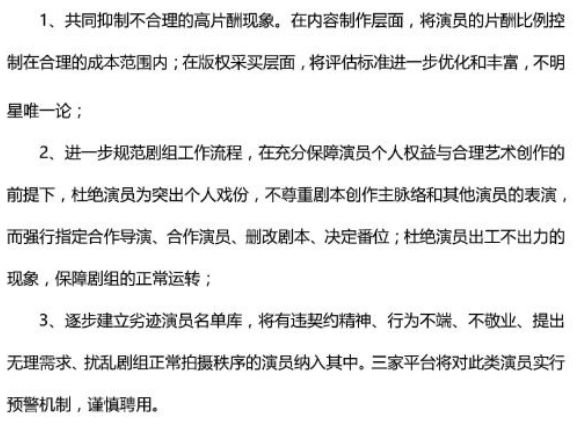 目前影视圈最大的资本和资源渠道掌握者,三大平台,也就是优酷、腾讯和爱奇艺,4月刚联合公开了《关于规范影视秩序及净化行业风气的倡议》,每一条都是在限制「流量」的权利。