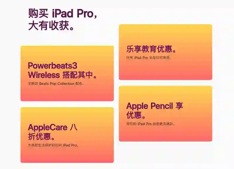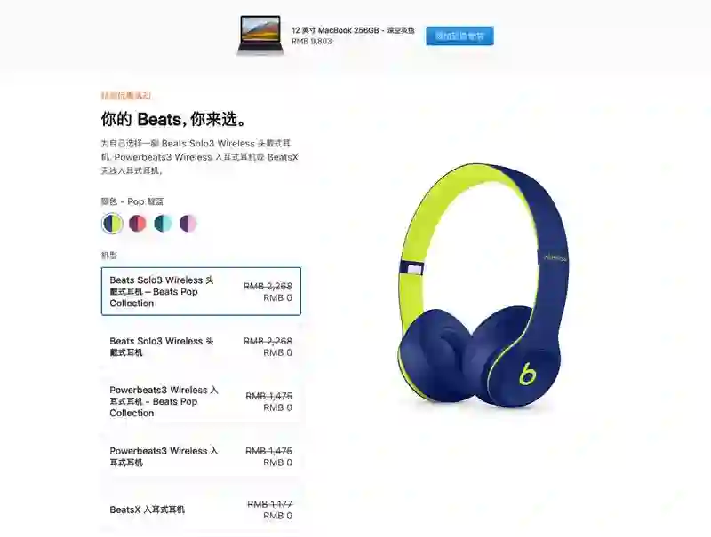 本次 Mac、iMac 、MacBook 系列和所有 iPad Pro 均参与赠送 Beats 耳机的活动,购买符合条件的 Mac 机型将附赠价值 2268 元的 Beats Solo3 Wireless 头戴式耳机,同时还有全新的 Beats Pop Collection 配色可选。购买全系 iPad Pro 则会赠送 价值 1475 元的 Powerbeats3 Wireless 耳挂式入耳耳机,同样提供新配色可选。