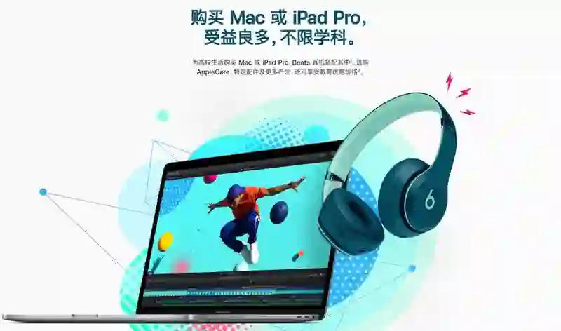 2018 年苹果返校季促销活动已经在 7 月 12 日正式拉开大幕,在官网上,苹果放出了“购买 Mac 或 iPad Pro,受益良多,不限学科”的广告语。当然,重点还是下方“为高校生活购买 Mac 或 iPad Pro,Beats 耳机搭配其中”的口号,除此之外,AppleCare、特定配件等产品也同样参与优惠!