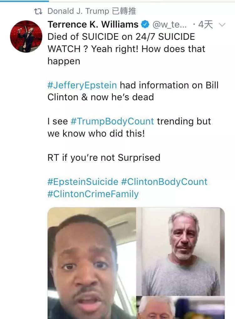 由于这位金融家的「熟人」涉及多国政界、商界、娱乐界的名流,他「明显的自杀」几乎立刻引发了美国人在推特上的阴谋论狂欢。尽管没有任何证据,大家还是把矛头直指美国总统特朗普以及前总统比尔·克林顿,两位都是爱泼斯坦生前的好友。#ClintonBodyCount 和 #TrumpBodyCount 立刻上了推特热搜,各种关于「杀人灭口」的阴谋论伴随着抖包袱的表情包层出不穷。就连特朗普本人也转发了一条阴谋论的推特,这条推特写道,「爱泼斯坦有克林顿的把柄,现在他死了,我们都知道是谁干的。」