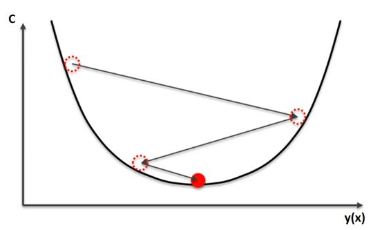 整个训练的关键是给权重设置正确的值,从而在神经网络中得到期望的输出。这就意味着,我们要使误差向量尽可能小,即找到成本函数的全局最小值。其中一种解决办法是使用微积分。我们可以计算导数,并使用它们找到成本函数的极值所在。然而,这里的成本函数并不是一两个变量的函数,而是网络中所有权重的函数,计算量很快就会变得不可行。这也是为什么我们要使用梯度下降技术。