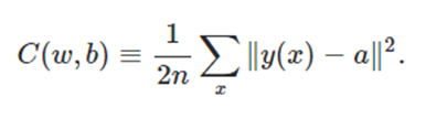 这里,x是训练集中的输入向量,y(x)是人工神经网络产生的输出, a是期望的输出。此外,可以看到这个函数是关于w和b的函数,他们分别代表了权重和偏差(biases)。