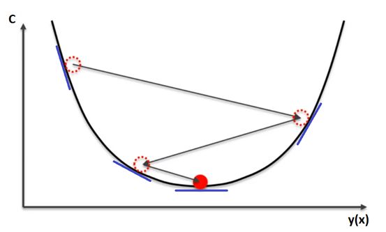 本质上,我们可以如此看待小球的行为:小球从左到右优化它的位置,最终到达谷底,在本例中,底部就是误差函数的最小值。这就是梯度下降算法在做的事情,它从一个位置开始,计算成本函数C的导数和二阶导数得到关于“小球”朝哪滚的信息。每次我们计算导数时,我们都可以得到当前位置山谷边坡的斜率信息,这在下图中用蓝线表示。