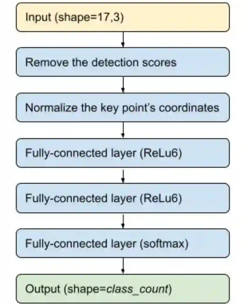 TensorFlow Lite 姿态分类模型非常小,其大小只有 30KB 左右。该模型从 MoveNet 中获取标记点输出,使姿态坐标标准化,并将坐标传递至几个完全连接的层中。模型的输出是一个概率列表,即姿态为每个已知的姿态类别。