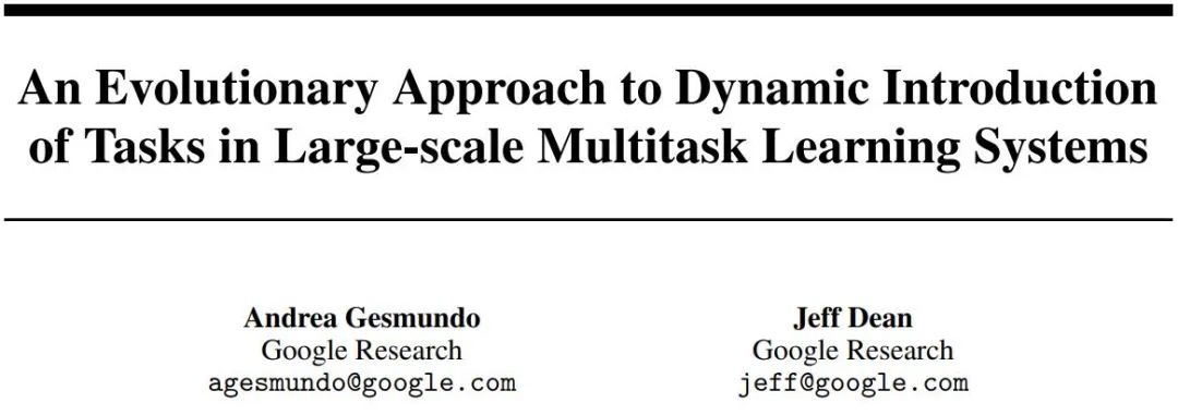 事情要从这周四说起,谷歌研究员 Andrea Gesmundo 和谷歌 AI 负责人、大牛 Jeff Dean 的论文《An Evolutionary Approach to Dynamic Introduction of Tasks in Large-scale Multitask Learning Systems》被提交到了预印版论文平台 arXiv 上。