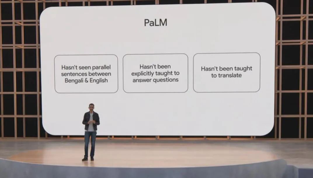 在 5 月 12 日的谷歌 IO 大会上,皮查伊还表示研究人员用 Pathways 系统训练了一个 5400 亿参数的大型语言模型 PaLM,这是一个只有解码器的密集 Transformer 模型。可以完成的任务包括自动生成代码、解决数学问题、修复 bug,解释笑话的梗等等。PaLM 可以区分因果关系,理解上下文中的概念组合。