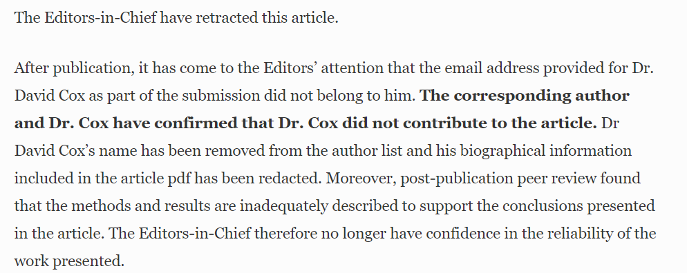 Springer Nature 发布的撤回声明。该声明表示,论文的通讯作者已经证实,Cox 对论文没有贡献。同时,新一轮的同行评审发现,两篇论文提出的方法和结果描述不足以支撑论文的结论,因此,期刊主编对该论文的可靠性不再抱有信心。