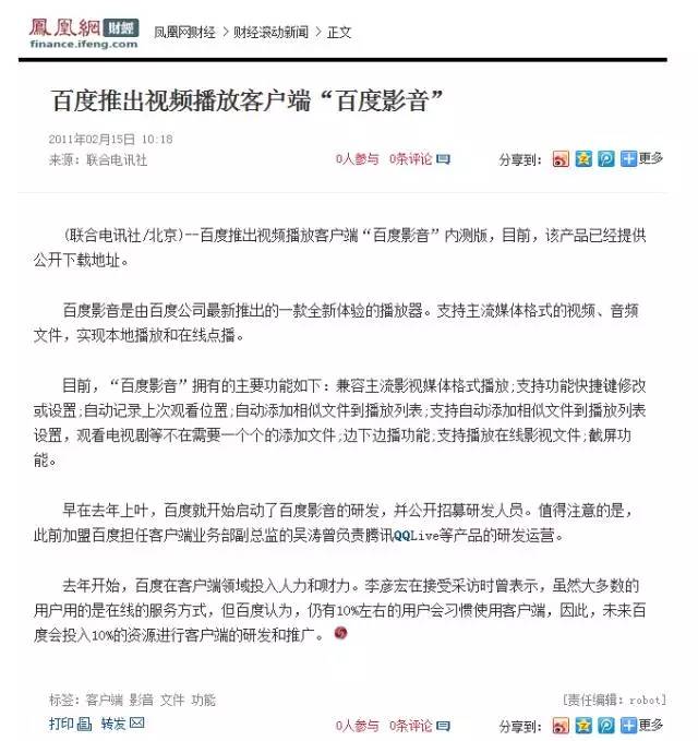 特别是QVOD快播,不仅是百度工具栏的主要安装来源,更是360安全卫士的主要安装来源。为了让用户新增渠道安全度提升,也为了有效打击对手,果断申请要做“百度影音”这个产品。PC-core也非常支持,当时还专门在Robin大会议室开了一个汇报会,各位e-staff成员一致通过要马上开始。