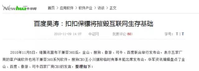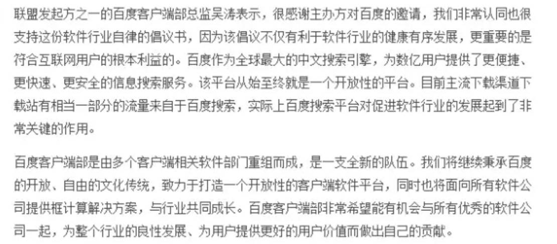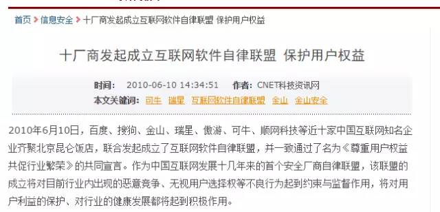 也是因为这个,我也被迫卷入了2010年轰动整个互联网行业的“3Q大战”,成为这段历史的亲身经历者。当时百度、搜狗、金山等发起了互联网软件自律联盟,我代表百度去做了一个中规中矩的发言,但是也明确表明了百度的立场,会更加开放、支持良性发展。