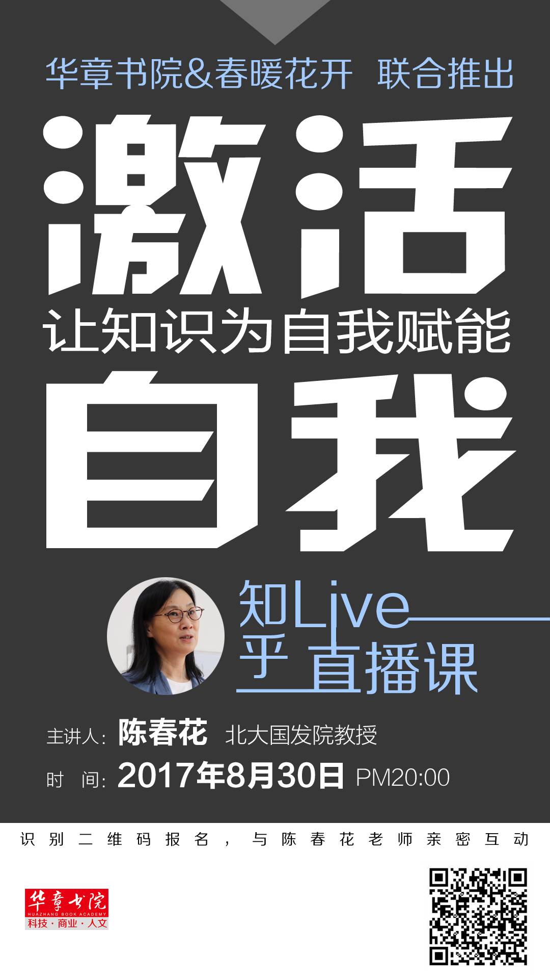 8月30日晚20:00,在知乎Live直播间,「华章书院」携手「春暖花开」邀请北京大学国家发展研究院教授、商界领袖陈春花老师为你带来一场「激活自我:让知识为自我赋能」主题线上分享。