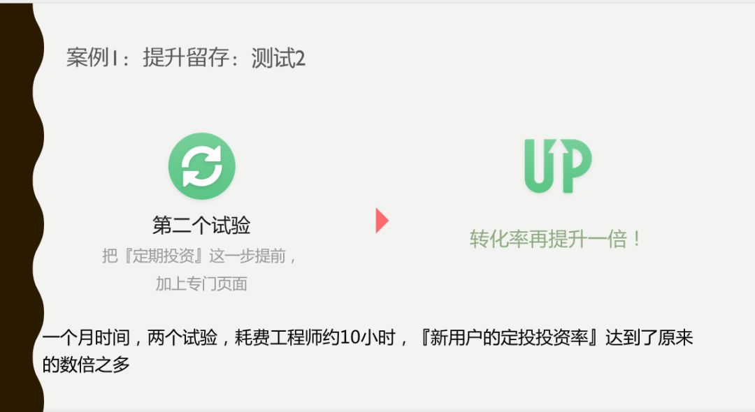 根据我们上面说的杠杆点,我们又做了第二个实验。既然很多用户都愿意做定投,我们就把最开始流程改变了,把定投放在一次性投资前面,定投金额是从少到多的选择。如果你不愿意,你可以继续选择做一次性的投资。