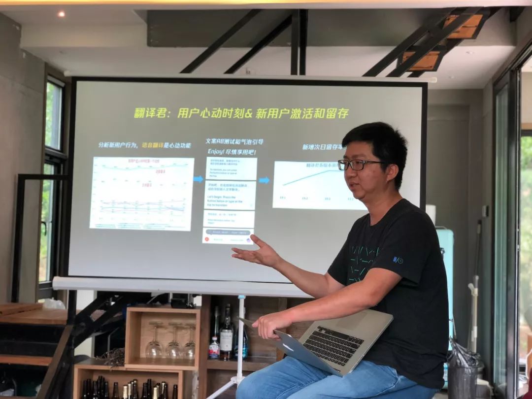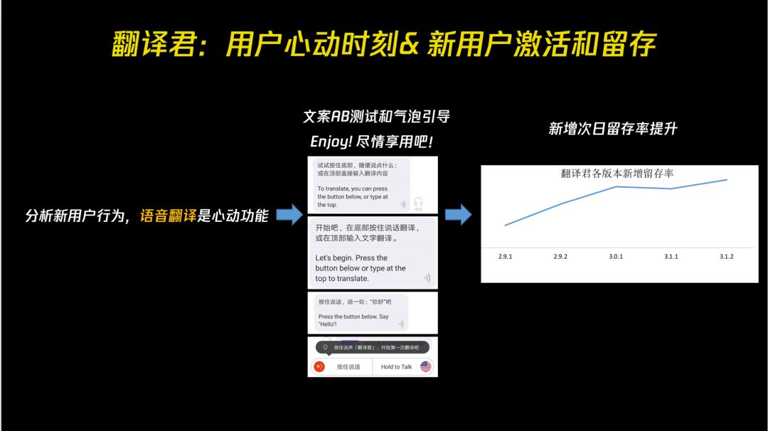 在翻译君这个产品上,我们还是想做一些提升留存的事情。怎么去做新用户激活,我们在新用户行为里进行了分析,在语音翻译这块儿如果是他的第一个动作,他的留存率明显是高的。我们就做了很多引导和 A/B 测试,包括文案、气泡等效果还是不错的,次日留存达到了 30%。但是我们发现长期留存还是很低,一个产品如果没有留存,单纯的导量意义也是不大的。我们就觉得还是应该先把产品打磨好,做一个偏高频的产品。
