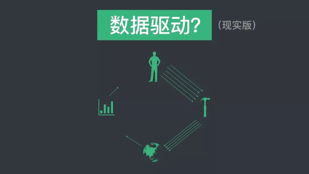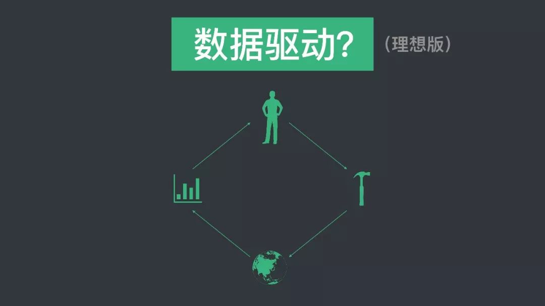 数据驱动特别简单,总结起来就是四步。产品经理想了一个方法,把方法推到市场上,从市场上把数据回收回来,回收回来再观察数据。做下一个决策 。这是理想版