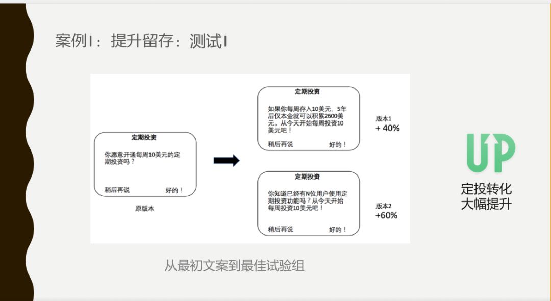 提高留存你需要找到导致留存的行为,留存是一个结果。你没办法直接改善结果,所以你需要找到它的原因。在 Acorns 里,我们其实看到定投这个功能和留存的相关性,我们做了实验是提高了定投,我们回过头去看留存真的改善了,这就证明了他们的因果性。