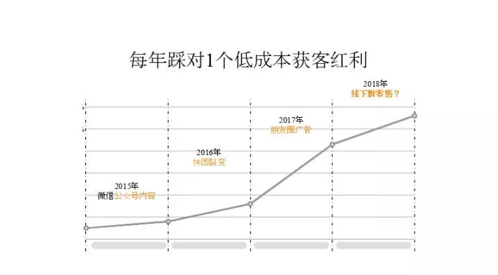2015 年的公众号内容、2016 年的拼团、2017年的朋友圈广告,大部分人都觉得当时朋友圈广告是一个带品牌的东西而不能带量,但是我们当时做了一系列的优化,可以说实现了和其他相比非常低的获客成本。但是到后来已经水涨船高了。不管你在怎么优化都已经不 work 了。