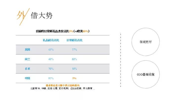 对于日常鲜花来说,国内日常鲜花的线下购买并不如国外便利,可能随手就可以买一束带回家,其次,日常鲜花对瓶插期的要求会略高,市场并没有很好的竞品。