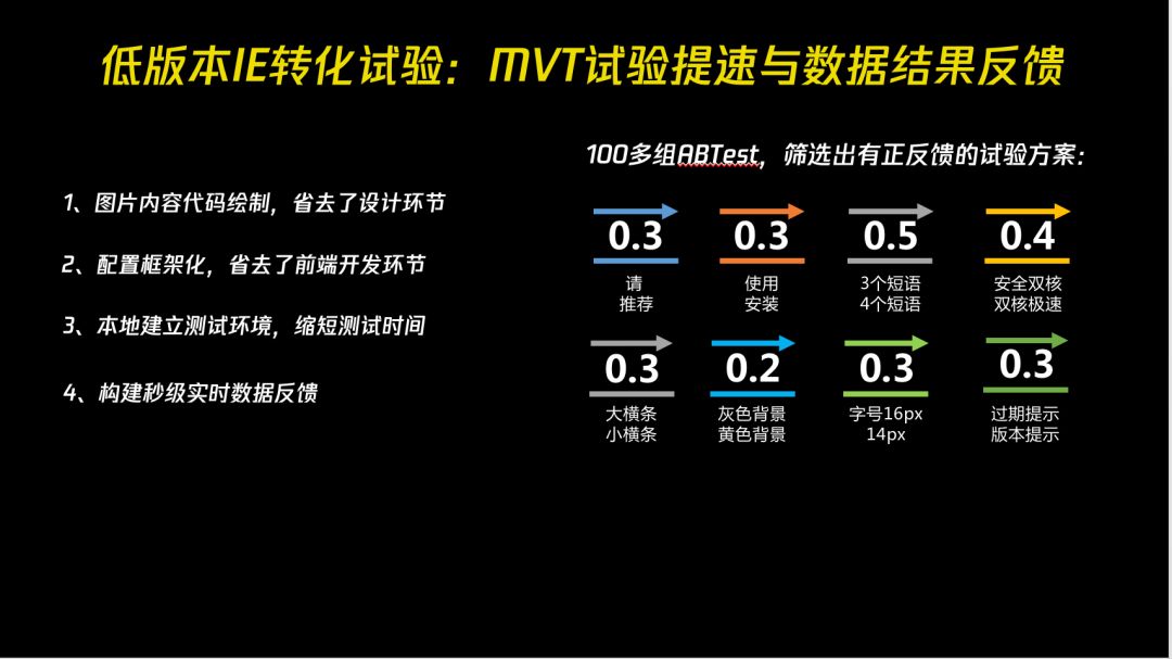 我们就继续乘胜追击,对官网进行一些实验。传统的做官网是一个非常大的工程,刚开始团队是有反对声音的。但是我们还是想利用 MVT 模式进行一些 A/B 测试。最后也利用累计进化的方式使得最后下载转化率有很大幅提升。