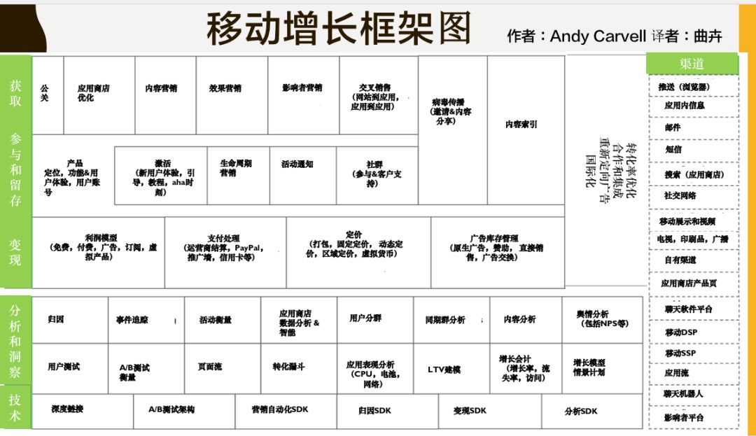 这是一个德国人做的一个移动增长框架图。如图可以看到从获取、参与、留存都有很多事情可以做。