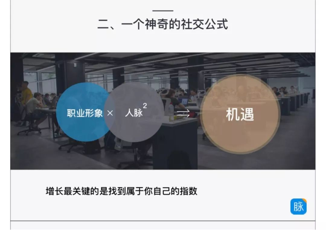 机遇 = 职业形象 × 人脉的平方,是一个很有意思的公式。它既是脉脉产品价值的核心公式,又是脉脉在两年来快速增长的最关键的公式。Profile 是人的个性,而人脉是人的共性。个性带来一个量级用户成本规模的降低,再乘以共性,最终带来指数增长。