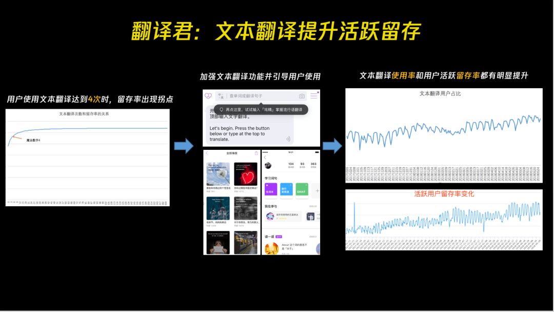 这里我们又开始做了大量的分析,分析过后发现在翻译这块儿活跃度超过 8 天的用户全都在使用文本翻译,后来我们还是觉得学习、教育是高存的产品,所以在围绕文本翻译这块儿做了很多事情来强化它,包括双语海报、生词本等等。但是我们没有把他做的很重,这些毕竟不是新用户的心动时刻。