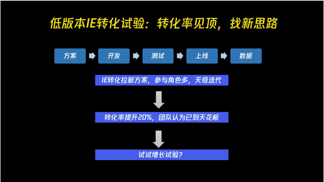 这之后我们又开始做了很多的测试。IE 的低成本获客之后,成为了我们的主获客渠道。后来我让团队里的产品和运营的同学去继续优化这个产品这个时候转化率已经提升到 20%,整个转化率已经见顶了。这个时候大家在想寻找增长杠杆已经到底,但是在增长黑客比较核心的实验我们还没开始做起来。