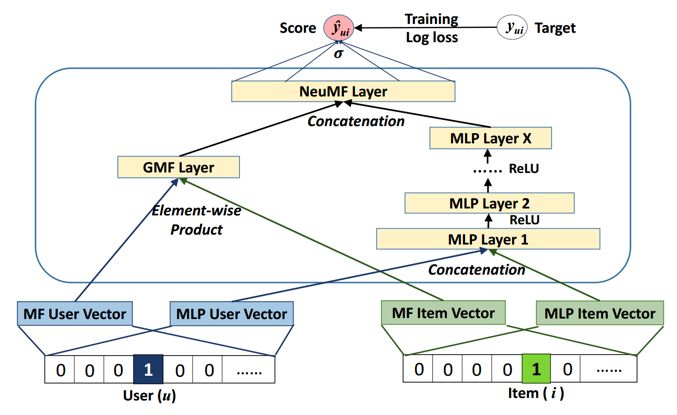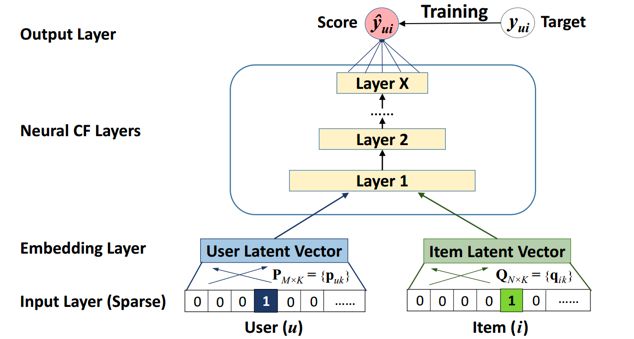 下图是 NCF 的框架,user 和 item 的 id 先经过 embedding 层得到一个特征,然后输入到 MLP 中得到打分结果,用 pointwise 的目标函数进行训练: