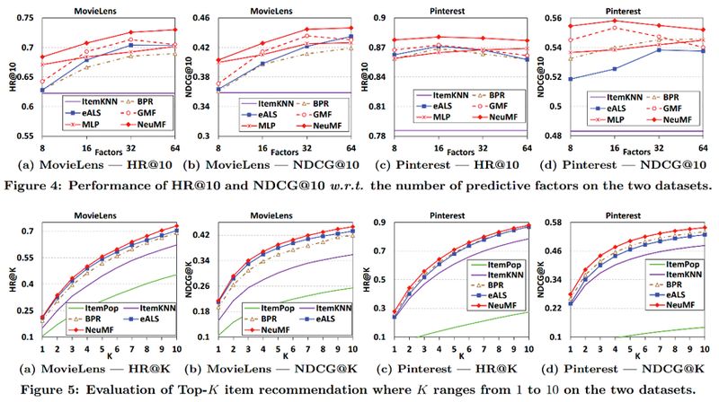 本文在 MovieLens,Pinterest 两个数据集上进行了验证,使用了 HR@10,NDCG@10 作为指标,使用了 itempop,itemknn,bpr,eALS 作为 baseline: