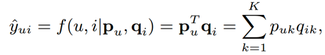 MF 利用特征向量 pu、qi 的内积评估 u 对 i 的偏好: