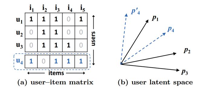 使用 jaccard 系数(集合 A 与 B 的交集与并集的比值作为集合的相似度)来作为用户之间真实的相似程度,那么下面评分矩阵用户 123 之间 S23>S12>S13,在 latent space 中的几何关系如右图所示,加入用户 4 时,S41>S43>S42,于是我们让用户 4 的特征靠近 1,然而无论怎么放,都无法使用户 3 比用户 2 更接近用户 4。