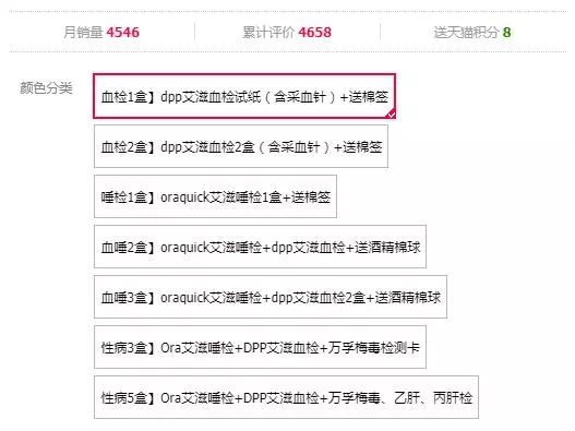 考虑到隐私性,目前大家自检通常都以网络购买为主。根据医谷从阿里健康获取的消息,2018年以来,用户在淘宝搜索“HIV”的次数较去年同期增长了100%,在阿里健康天猫平台购买HIV检测试纸的订单则超过了200万单。医谷在天猫搜索HIV或HIV试纸,显示提供该服务的商品超过数百个,价格从几十元到几百元不等,都可以类似验孕棒的方式自行完成检测,各个店铺的月销量从几十件到上千件不等。产品包括唾液检测、血液检测等,同时很多产品为了提高竞争力,往往会将更多性病、传染性疾病进行延展和组合,如淋病、梅毒、乙肝、丙肝等。